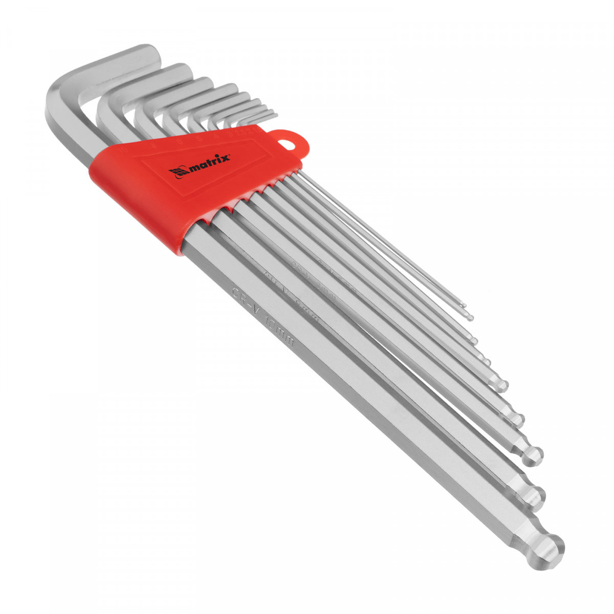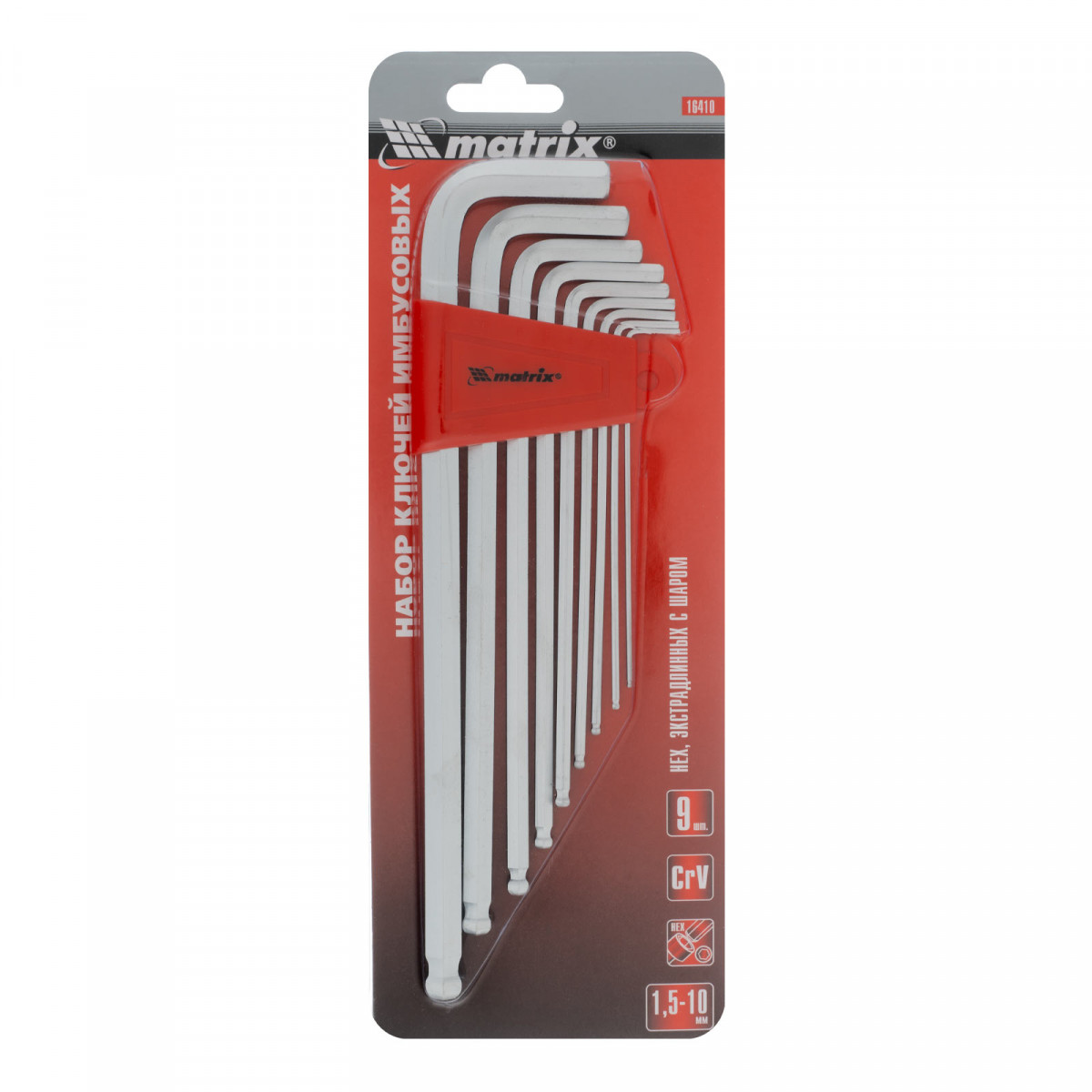 Набор из 9 экстра-длинных имбусовых ключей Matrix 16410 с шаром и сатинированным покрытием, из стали CrV, предназначен для монтажа и демонтажа болтов с внутренним шестигранником HEX 1,5-10 мм. Набор будет полезен для сборки мебели и ремонта велосипедов. Экстра-длинные ключи Г-образной формы облегчают работу в труднодоступных местах.