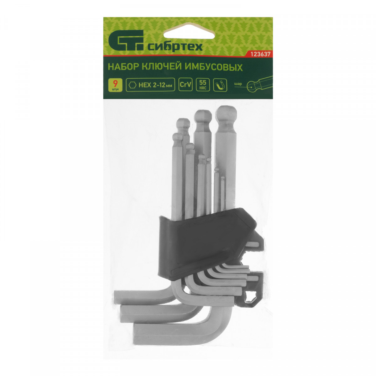 Набор ключей имбусовых, HEX, 2-12 мм, CrV, 9 шт., с шаром Сибртех