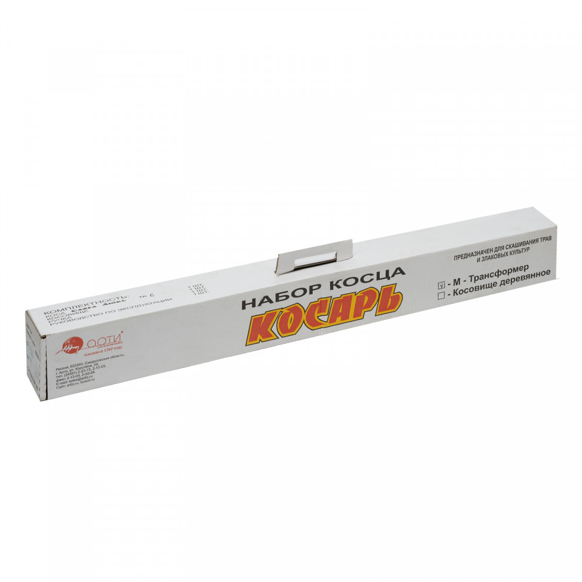 Набор косца АРТИ «Трансформер» №6 63579 включает косу «Сайга Люкс» с лезвием длиной 600 м и складное косовище. Используется для покоса травы на ровных участках большой площади. Косовище длиной 1700 мм позволяет косить с прямой спиной и долго не уставать. Полотно предварительно отбито и оправлено. Для придания лезвию остроты рекомендуется приобрести абразивный брусок — подойдет Сибртех 76425.
