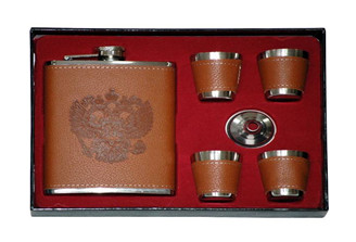 Набор (кожа с гербом): фляжка 240 мл, воронка, плюс 4 стопки.