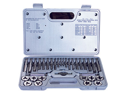 Набор включает 31 метчик и плашку из инструментальной стали для нарезания резьбы различных размеров.