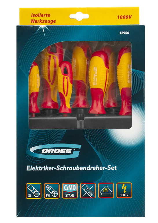 Набор отверток диэлектрических GROSS изготовлен из хром-молибденовой стали и предназначен для работы с электрическими цепями напряжением до 1000В.