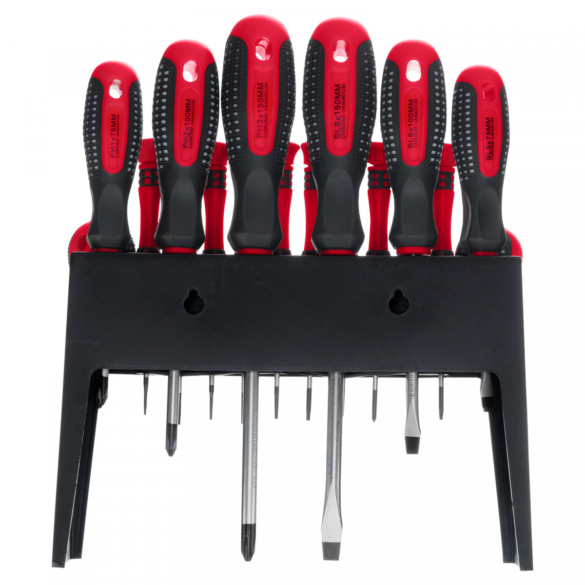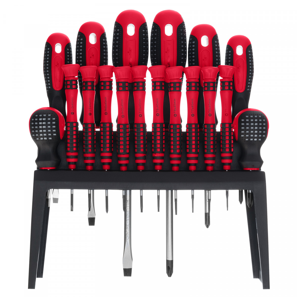• Удобное хранение — отвертки размещаются на пластиковой подставке, которую можно поставить на стол или повесить на стену.