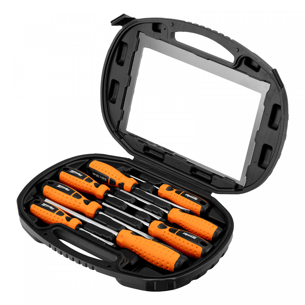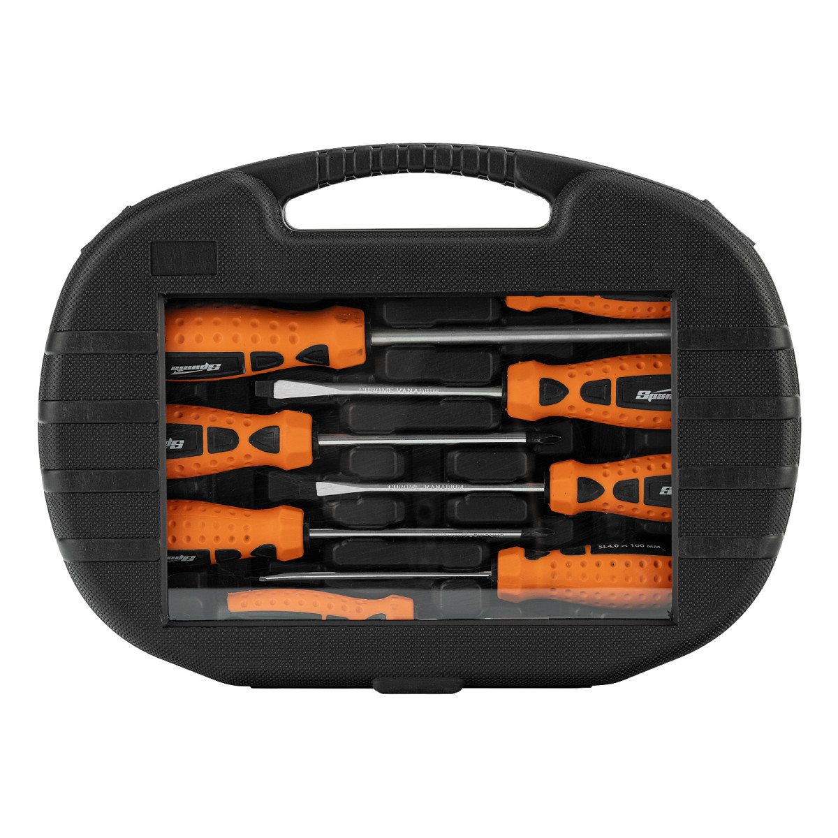 Набор отверток Sparta 133566, из стали СrV, в пластмассовом боксе, пригодится в быту для ремонтных и монтажных работ. В комплект входят отвертки со шлицами «Минус» и «Крест» для монтажа и демонтажа крепежных элементов соответствующего типа (SL и PH). Длина стержней варьируется в диапазоне 63-100 мм, что позволяет работать в небольших углублениях и труднодоступных местах.
