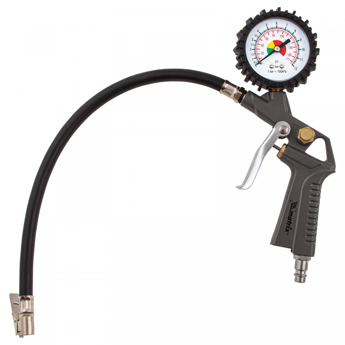 - Контроль давления — пистолет подкачки шин оснащен точным аналоговым манометром.