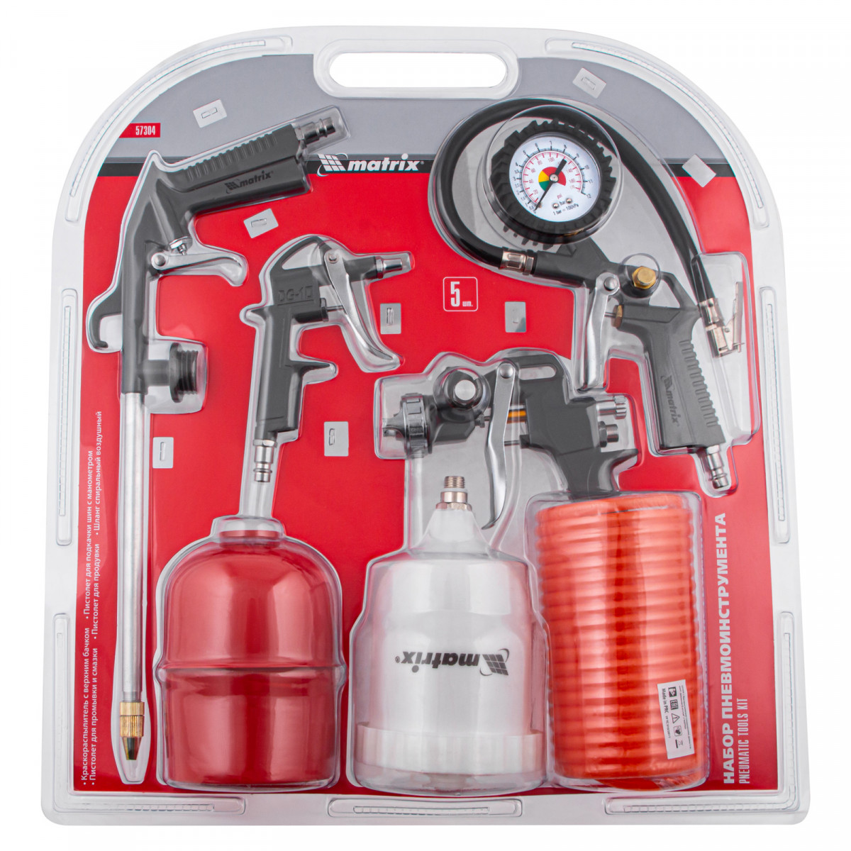Набор пневмоинструмента Matrix 57304 включает 5 предметов: промывочный пистолет, продувочный пистолет, пневмопистолет для накачки шин, краскораспылитель с верхним бачком и шланг с быстросъемным соединением. Пневмоинструменты совместимы со всеми типами компрессоров. Набор пригодится в автомастерской, на мебельном производстве, в гараже или при проведении ремонта.,С помощью краскораспылителя можно покрасить поверхности или покрыть их защитными составами. Промывочный пистолет предназначен для очистки и смазки различных поверхностей. Пистолет для подкачки шин позволяет измерить давление в шине и накачать ее. Продувочный пистолет очищает поверхности и детали струей сжатого воздуха, а спиральный шланг служит для подключения пневмоинструмента к компрессору.