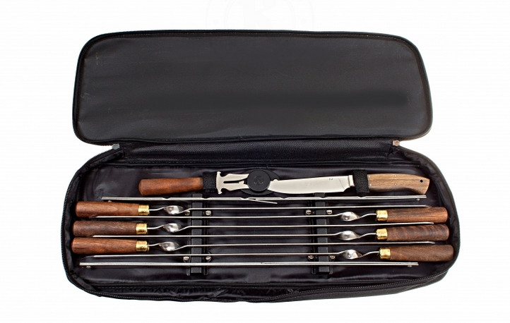Шампур: 6 шт.Нож хозяйственно-бытовой «Р-2»: 1шт.Вилка для снятия мяса с шампура: 1шт.Мангал складной (комплект, нерж. сталь) : 1шт.Футляр (полиэстер или нейлон): 1шт.