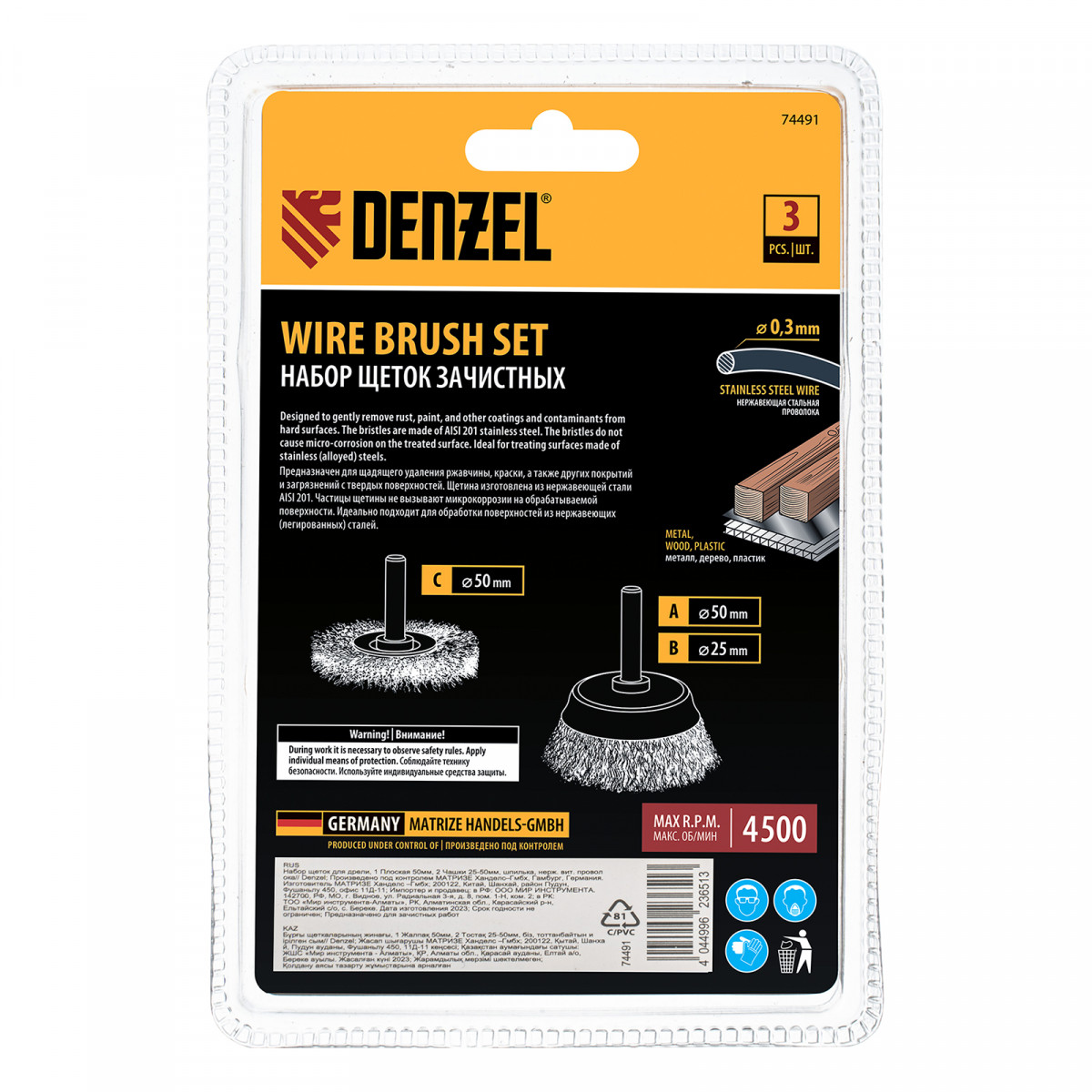 Набор щеток для дрели, 1 Плоская 50мм, 2 Чашки 25-50мм, шпилька, нерж. вит. проволока Denzel