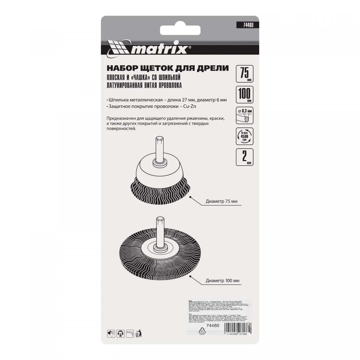 Набор щеток Matrix 74480 включает 2 насадки со шпильками диаметром 6 мм для установки на дрель: одну плоскую диаметром 100 мм и одну «чашку» диаметром 75 мм. С их помощью можно снять тонкий слой ржавчины и лакокрасочных покрытий, удалить загрязнения. Многопрофильный набор позволяет выбрать оптимальную насадку для обработки плоских поверхностей или углов и пазов.
