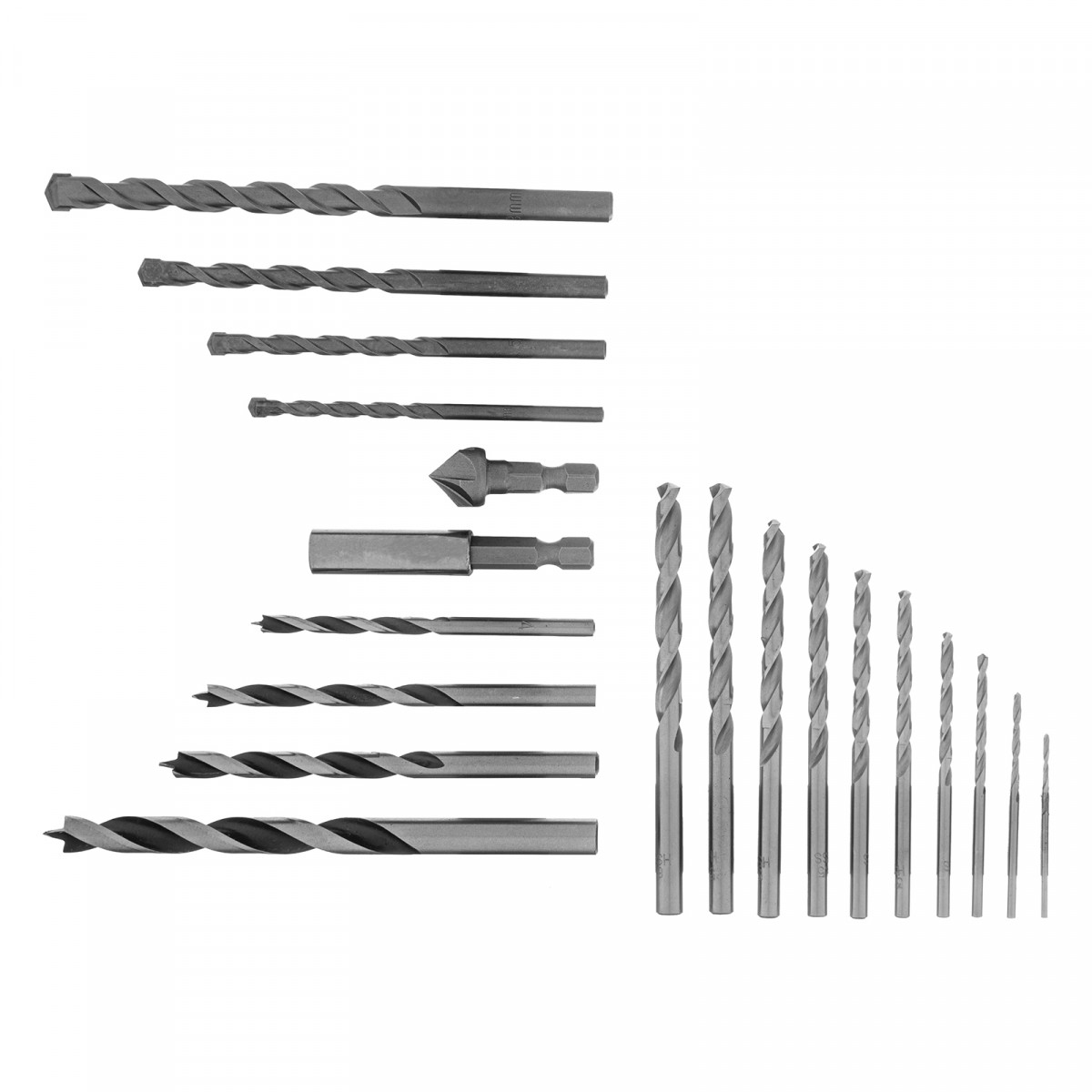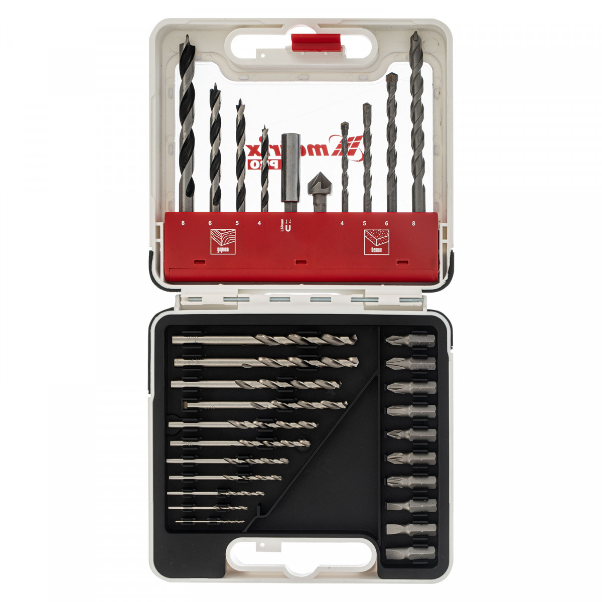 Набор сверл комбинированный, сверла по металлу 1-6 мм, бетону 4-8 мм, дереву 4-8 мм, биты 10 шт, адаптер, зенковка, 31 предмет Pro Matrix