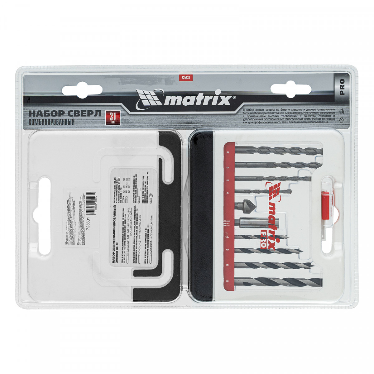 Комбинированный набор Matrix PRO 725631 — универсальное решение для мастеров, т. к. он содержит 31 предмет: отверточные биты (10 штук) и адаптер к ним, зенковку и сверла по дереву 4-8 мм, сверла по бетону 4-8 мм и сверла по металлу 1-6 мм. Оснастка подходит как для бытового использования, так и решения профессиональных задач.