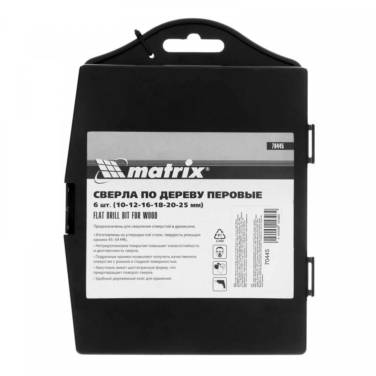 Набор Matrix 70445 состоит из 6 перовых сверл по дереву диаметром 10-12-16-18-20-25 мм и поставляется в пластиковом кейсе. Позволяет получать сквозные и глухие отверстия в древесине. Сверла устанавливаются на электрические и механические дрели или шуруповерты.