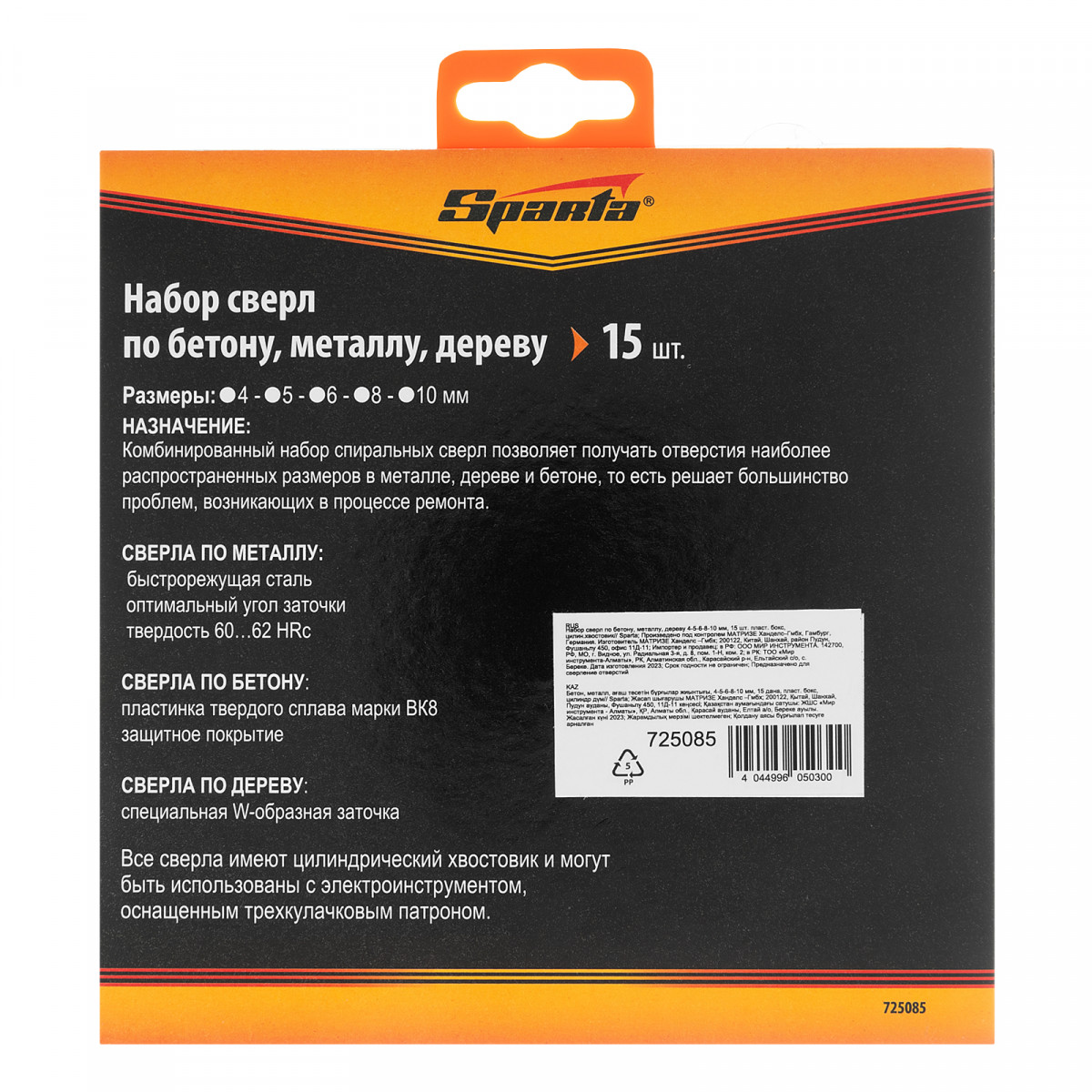 Набор Sparta 725085 включает 15 сверл с цилиндрическим хвостовиком, диаметром 4-5-6-8-10 мм, предназначенных для работ по бетону, металлу и дереву. В комплект поставки входят сверла самых популярных размеров, которые используют для бытового ремонта, монтажа и сборки различных конструкций.