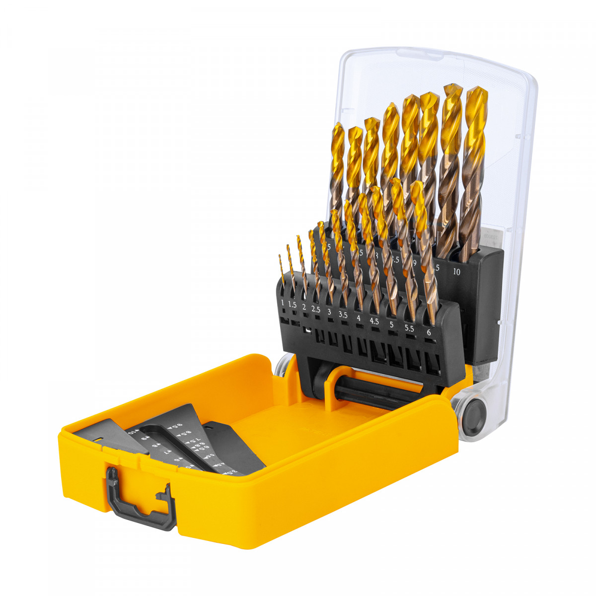 - Удобная упаковка — сверла поставляются в пластиковом кейсе с шаблоном для определения диаметра сверл.
