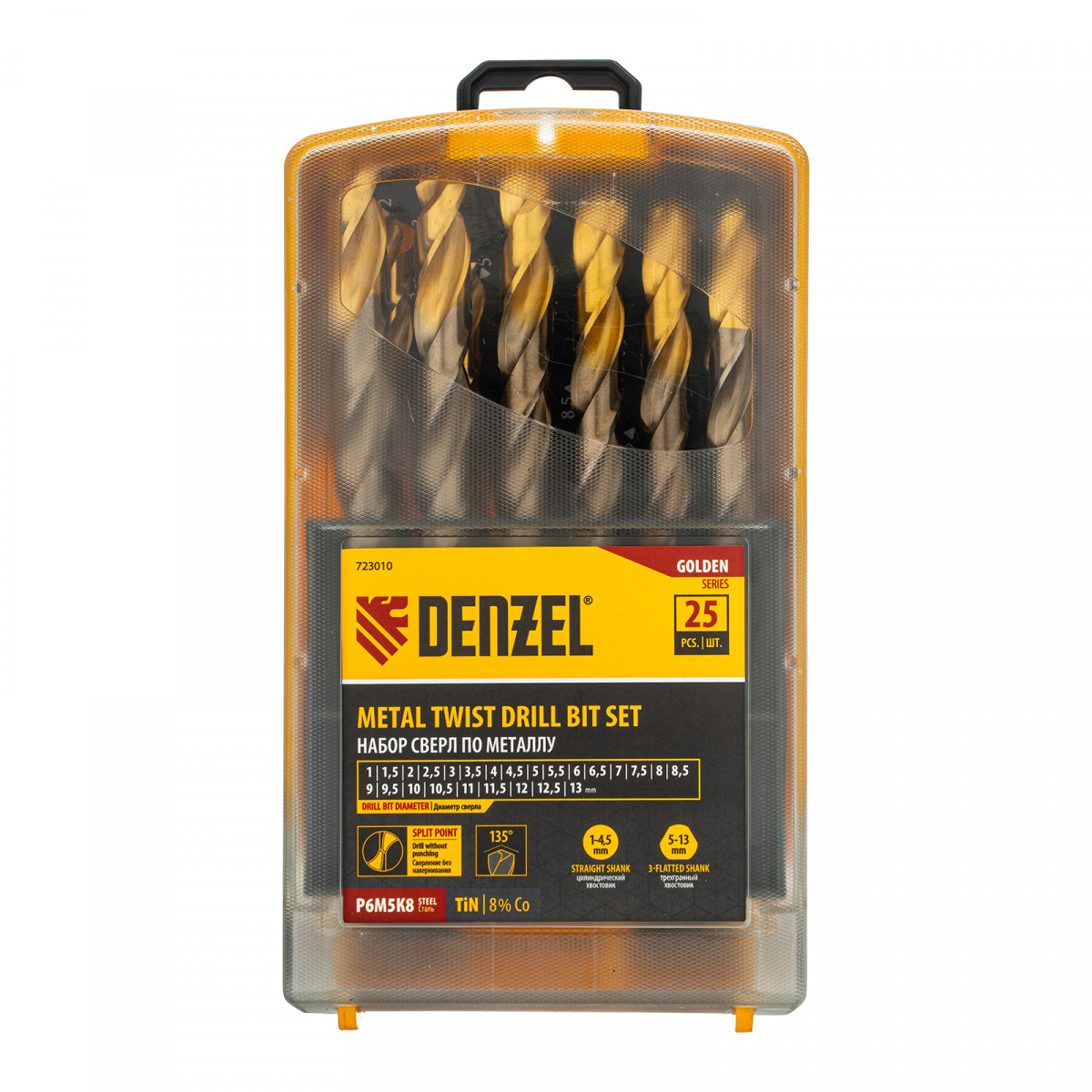 Набор сверл по металлу, 1-13 мм, Р6М5К8-TiN, Golden Tip, 25 шт Denzel