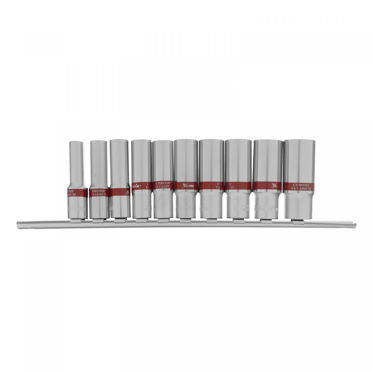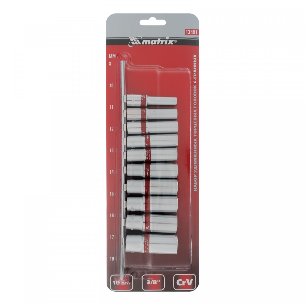 Набор удлиненных торцевых головок 3/8", 6 гранные, CrV, 8-19мм, 10 штук Matrix