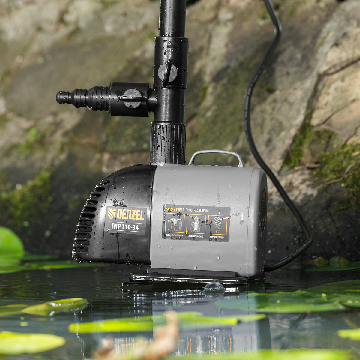Насос фонтанный FNP110-34, 112 Вт, подъем 3,4 м, 3400 л/ч, колокольчик/каскад/гейзер Denzel