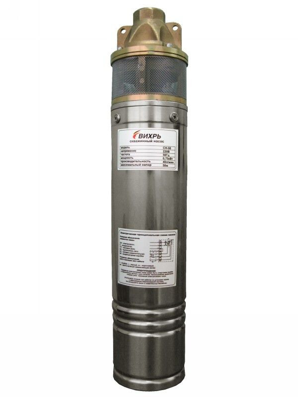Скважинный насос Вихрь СН-50 (с верхним забором воды) используется для подачи чистой воды из скважин или колодцев глубиной до 50 м в систему орошения сада или водопровод. Узкий корпус изготовлен из нержавеющей стали и, благодаря малогабаритности, позволяет выкачивать воду из скважин диаметром от 100 мм. В конструкции насоса предусмотрено термореле для защиты двигателя от перегрева.