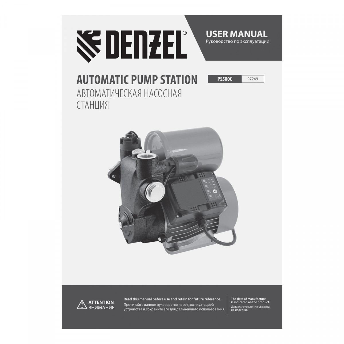 Насосная станция PS500C, 500 Вт, напор 35 м, 2200 л/ч, ресивер 2 л, блок управления Denzel