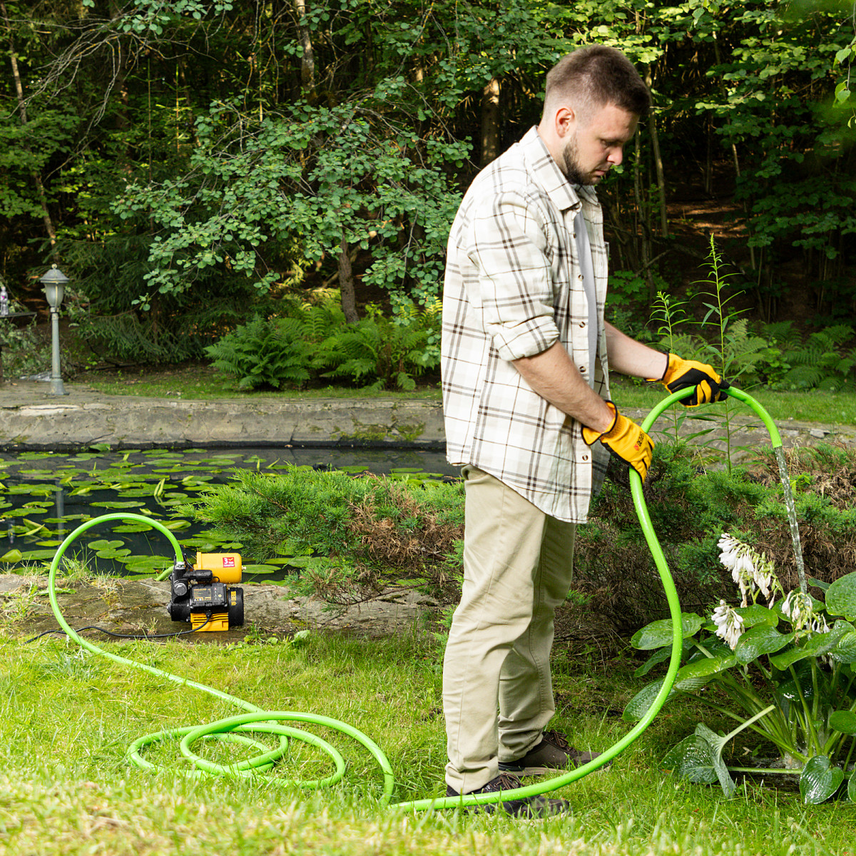 • Автономность — прессостат автоматически останавливает насос при достижении верхнего порогового давления в системе и запускает двигатель, если давление падает.