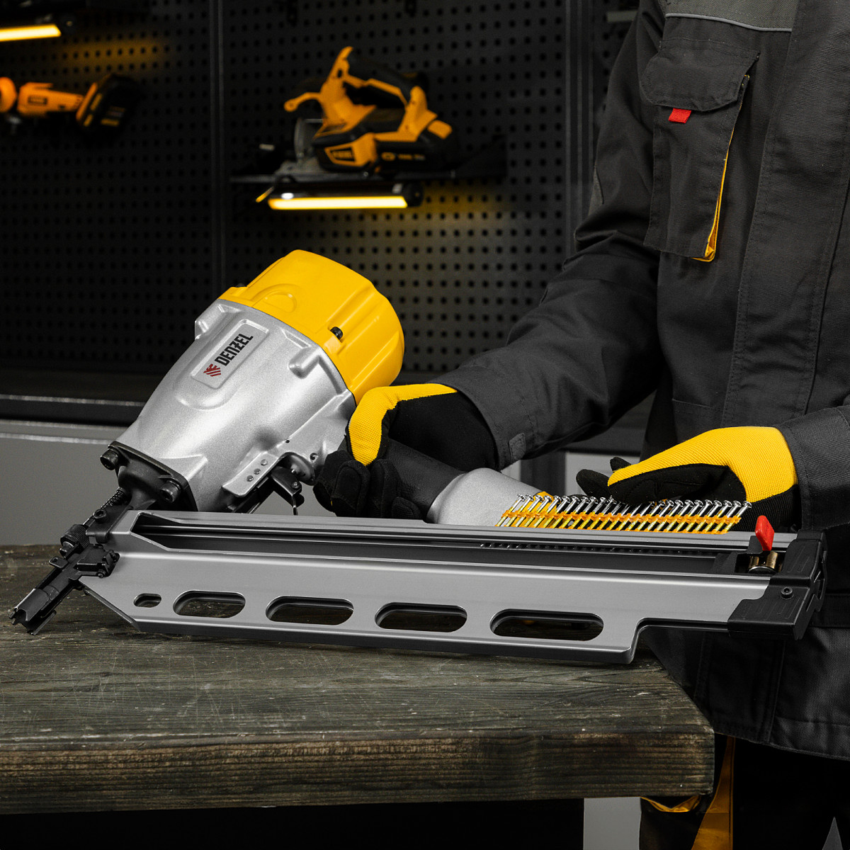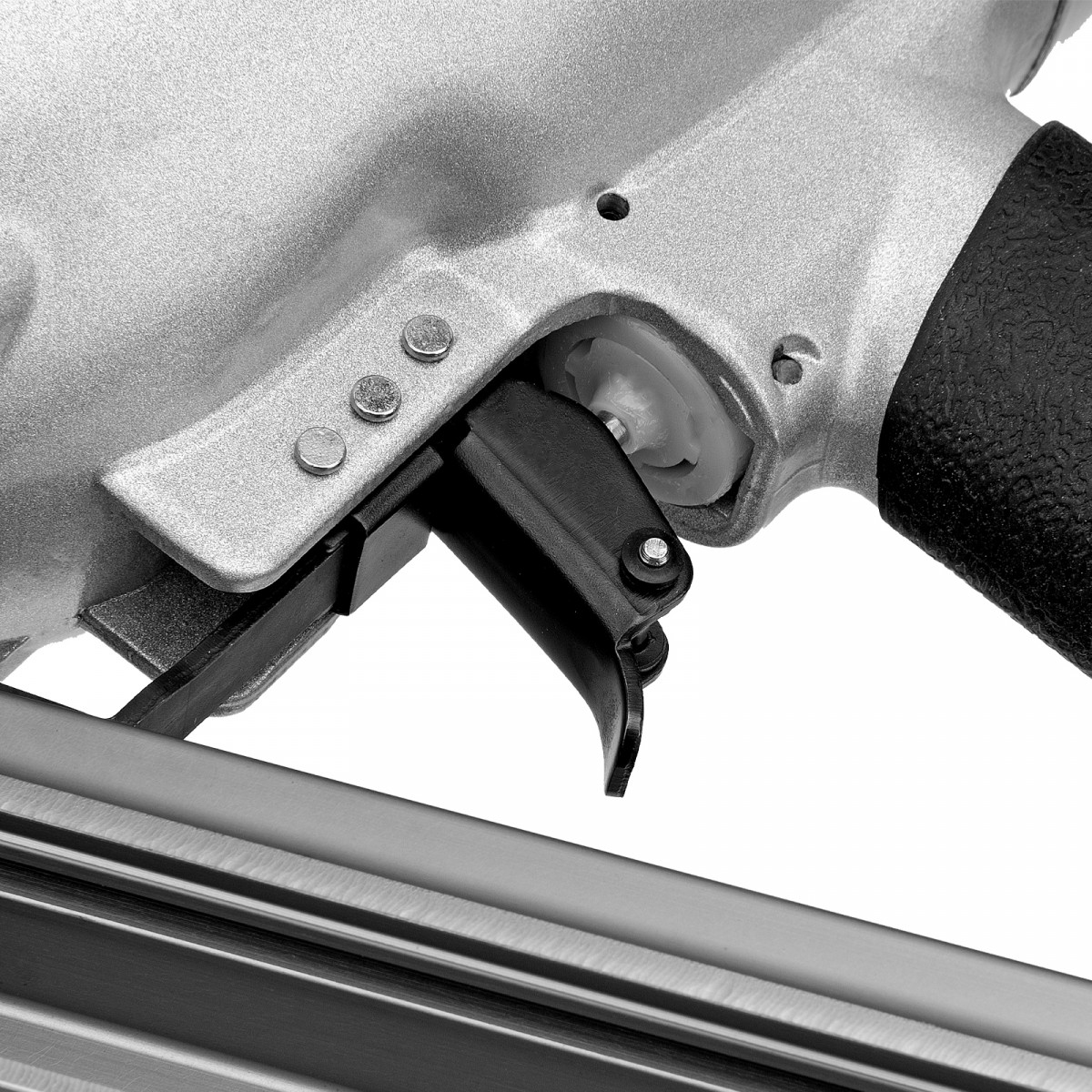 • Небольшой вес 3,8 кг — пистолет удобно удерживать одной рукой, в том числе при забивании гвоздей в вертикальные поверхности и потолок.