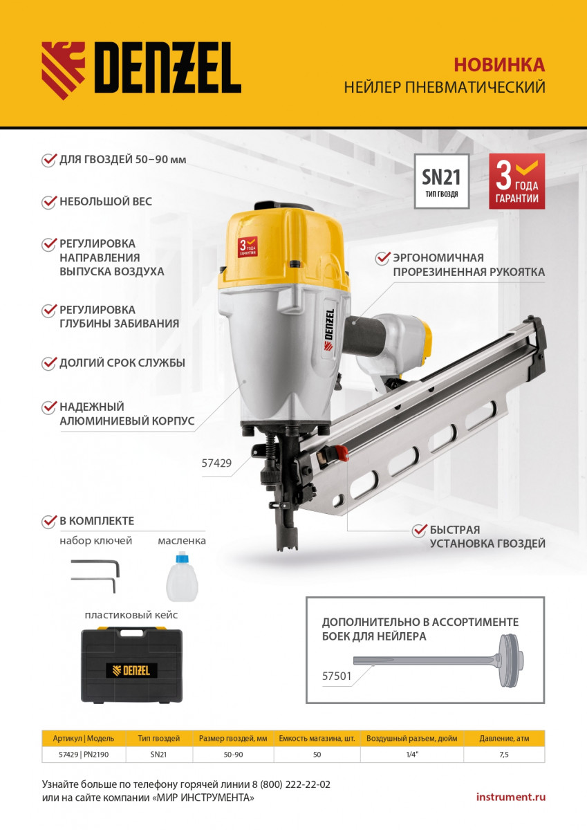 Нейлер пневматический PN2190 для гвоздей SN21 от 50 до 90 мм Denzel