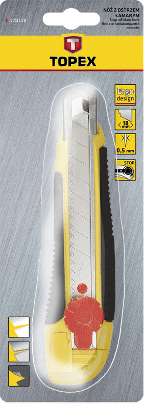 Нож с отламывающимся лезвием TOPEX для работы с лезвиями шириной 18 мм. Предназначен для выполнения механических работ, а также работ, выполняемых мастерами-любителями. Металлическая направляющая обеспечивает долгий срок службы. Корпус эргономичной формы из прочной пластмассы, с антискользящим покрытием, хорошо ложится в ладонь, что обеспечивает безопасность и комфорт во время работы.