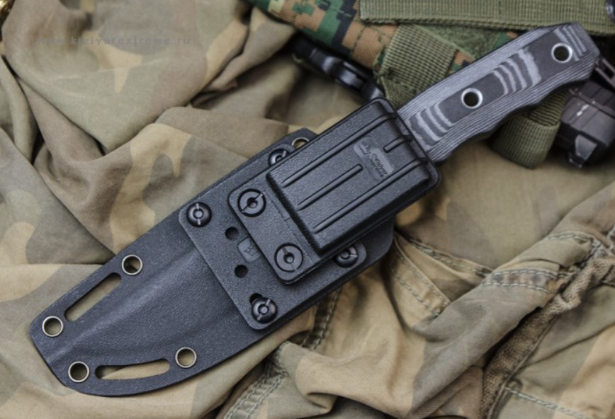 Ножны изготовлены из кайдекса - акрило-поливинилхлоридного сплава, в котором способность к формовке сочетается с высокой прочностью. Ножны из этого материала без вреда переносят самые суровые условия эксплуатации, а благодаря небольшой гибкости кайдекса чрезвычайно надежно удерживают нож без какого-либо дополнительного фиксатора.