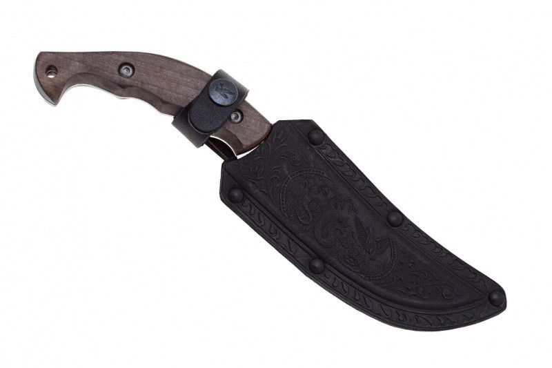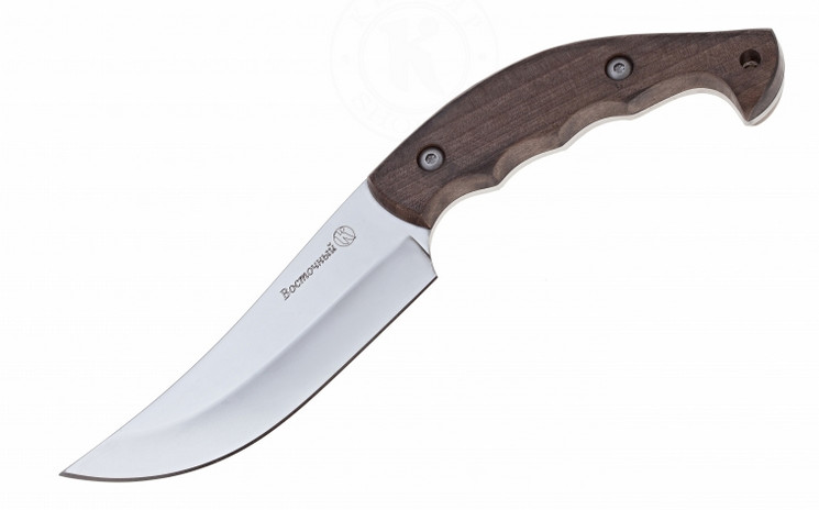 Туристический нож «ВОСТОЧНЫЙ» компании КИЗЛЯР сочетает характеристики скинера, туристического и тактического ножа. От скинера нож получил плавный подъем режущей кромки и возможность удерживать нож пальцами за клинок. С туристическими ножами его роднит изогнутый обух и взлетающий кончик. Таким ножом удобно резать продукты и потрошить рыбу. От «тактиков» ему досталась рукоятка пистолетного типа. Такая рукоять позволяет наносить быстрые колющие удары. Ножом удобно строгать и резать на весу. Комплектуется кожаными ножнами.
