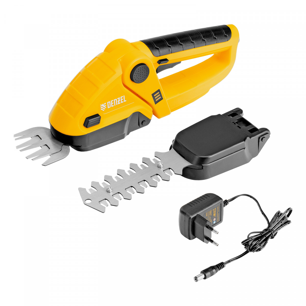 Ножницы-кусторез аккумуляторные - 1 штЛезвия для травы - 1 штЛезвия для кустарников - 1 штЗарядное устройство - 1 штРуководство по эксплуатации c гарантийным талоном - 1 штМодуль для подстригания травы - 1 штМодуль для ухода за кустами - 1 шт