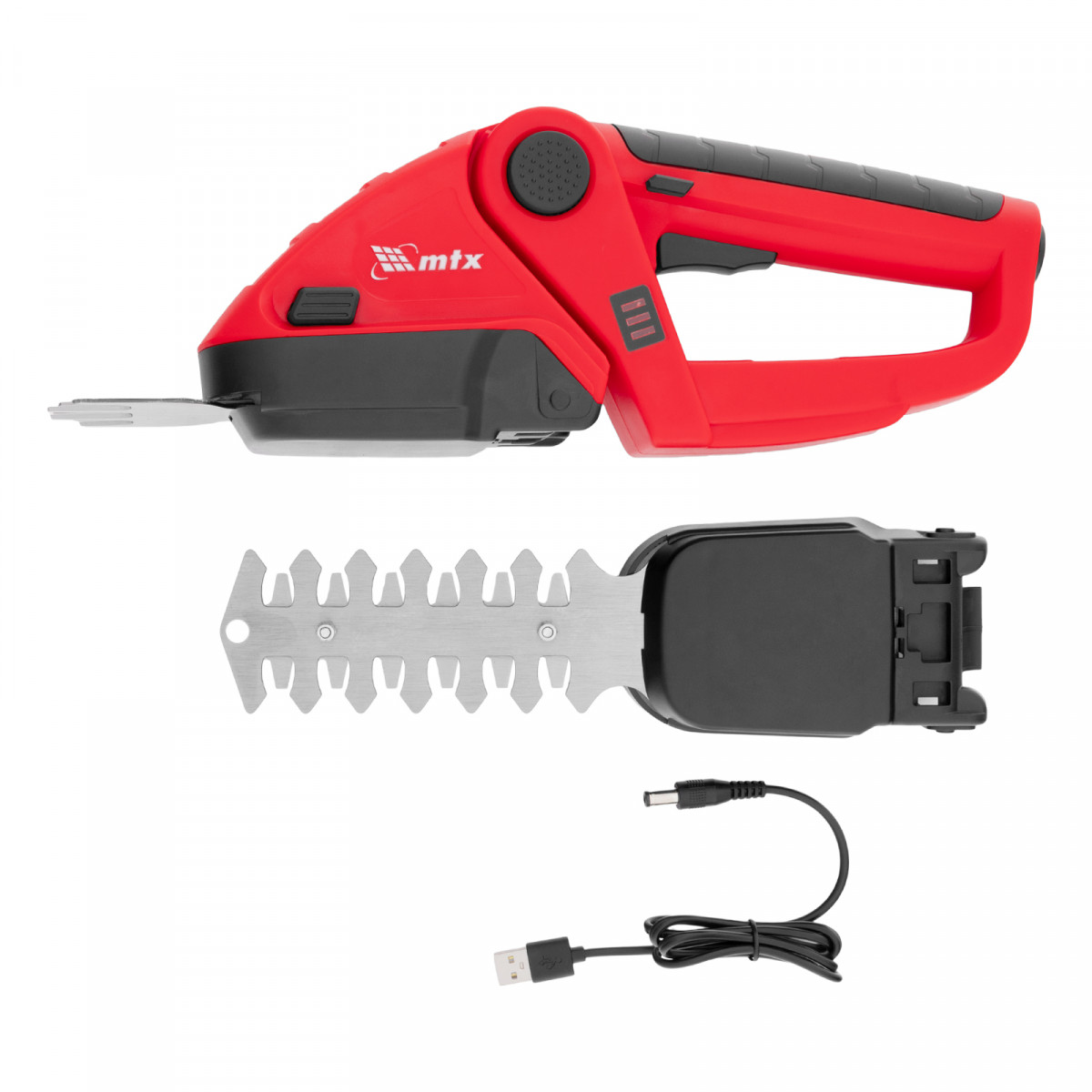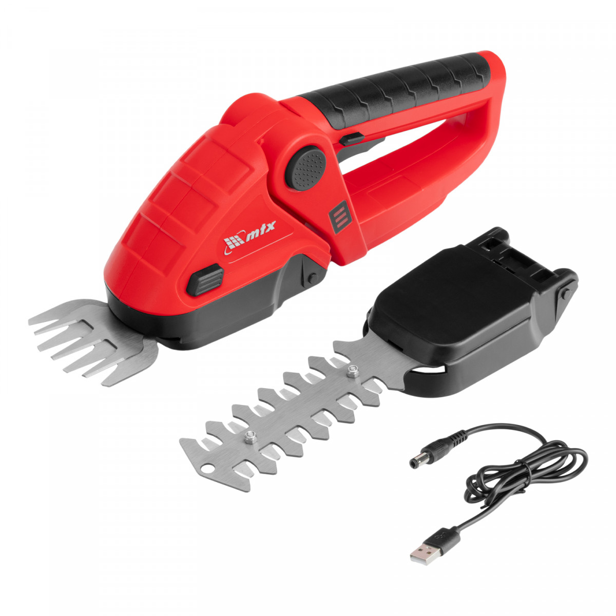 Ножницы-кусторез аккумуляторные - 1 штЛезвия для травы - 1 штЛезвия для кустарников - 1 штUSB-кабель - 1 штРуководство по эксплуатации c гарантийным талоном - 1 штМодуль для подстригания травы - 1 штМодуль для ухода за кустами - 1 шт