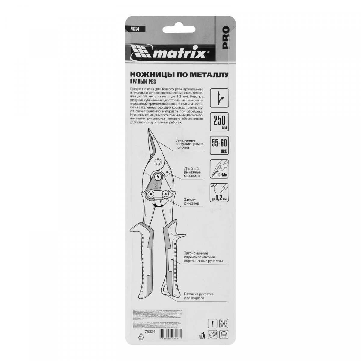 Ножницы по металлу Matrix PRO 78324 длиной 250 мм, с двухкомпонентными рукоятками, предназначены для правого реза листовых и профильных металлических заготовок, в том числе стали толщиной до 1,2 мм и нержавеющей стали толщиной до 0,8 мм. Двойной рычажный механизм позволяет прикладывать значительное усилие при резке толстого материала. Для удобства работы на корпусе имеется маркировка с указанием направления резания. Ножницы будут полезны в профессиональной и домашней мастерской.