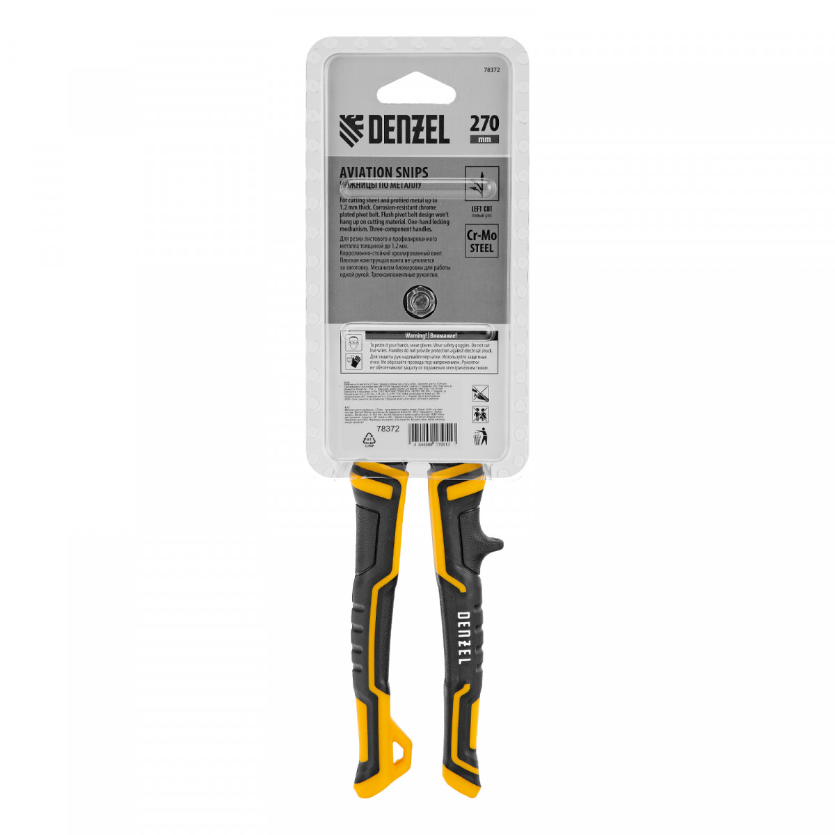 Ножницы по металлу Denzel 78372 общей длиной 270 мм, из стали-CrMo, с трехкомпонентными рукоятками, предназначены для прямого и левого реза листовых металлических заготовок и металлопрофиля толщиной до 1,2 мм. Инструмент с усиленной конструкцией осевого шарнира рассчитан на профессиональное использование. Ножницы используются для проведения строительных, кровельных и слесарных работ.