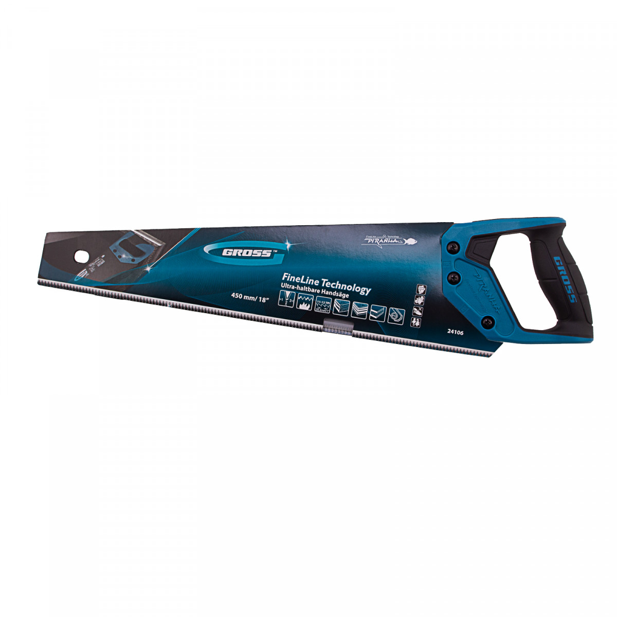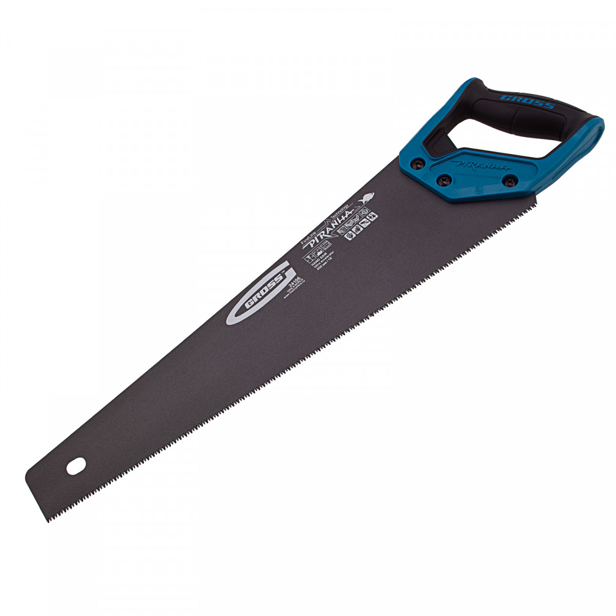 Ножовка по дереву Gross PIRANHA 24106 с полотном длиной 450 мм, калеными зубьями с 3D-заточкой и шагом 11-12 TPI, тефлоновым покрытием полотна и 2-компонентной рукояткой, используется для продольного и поперечного распиливания древесины различных пород, МДФ, ДСП, ДВП, ламината, а также пенополистирола, полиуретана и других синтетических материалов. Рабочая часть состоит из мелких зубьев с шагом 2-2,3 мм, что позволяет получить ровный и чистый рез. Трехгранная заточка зубьев увеличивает производительность инструмента без потери качества распиловки. Ножовка предназначена для столярных работ.