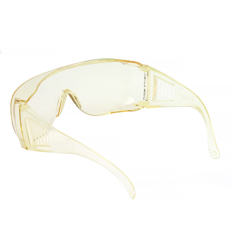 Универсальные очки с панорамным защитным стеклом увеличенного размера из светло-жёлтого поликарбоната с твердым покрытием на наружной стороне и с незапотевающим покрытием на внутренней, обращенной к глазу, стороне. Защитное стекло отличается высокими оптическими характеристиками. Надежная защита глаз сверху и с боков от высокоскоростных частиц, капель жидкостей, брызг растворов кислот и щелочей, УФ- и ИК- излучения (405 нм). Широкий заушник для повышенной боковой защиты. Увеличенная защита сверху и с боков. Регулируемый угол наклона защитного стекла. Возможность ношения с корригирующими очками.