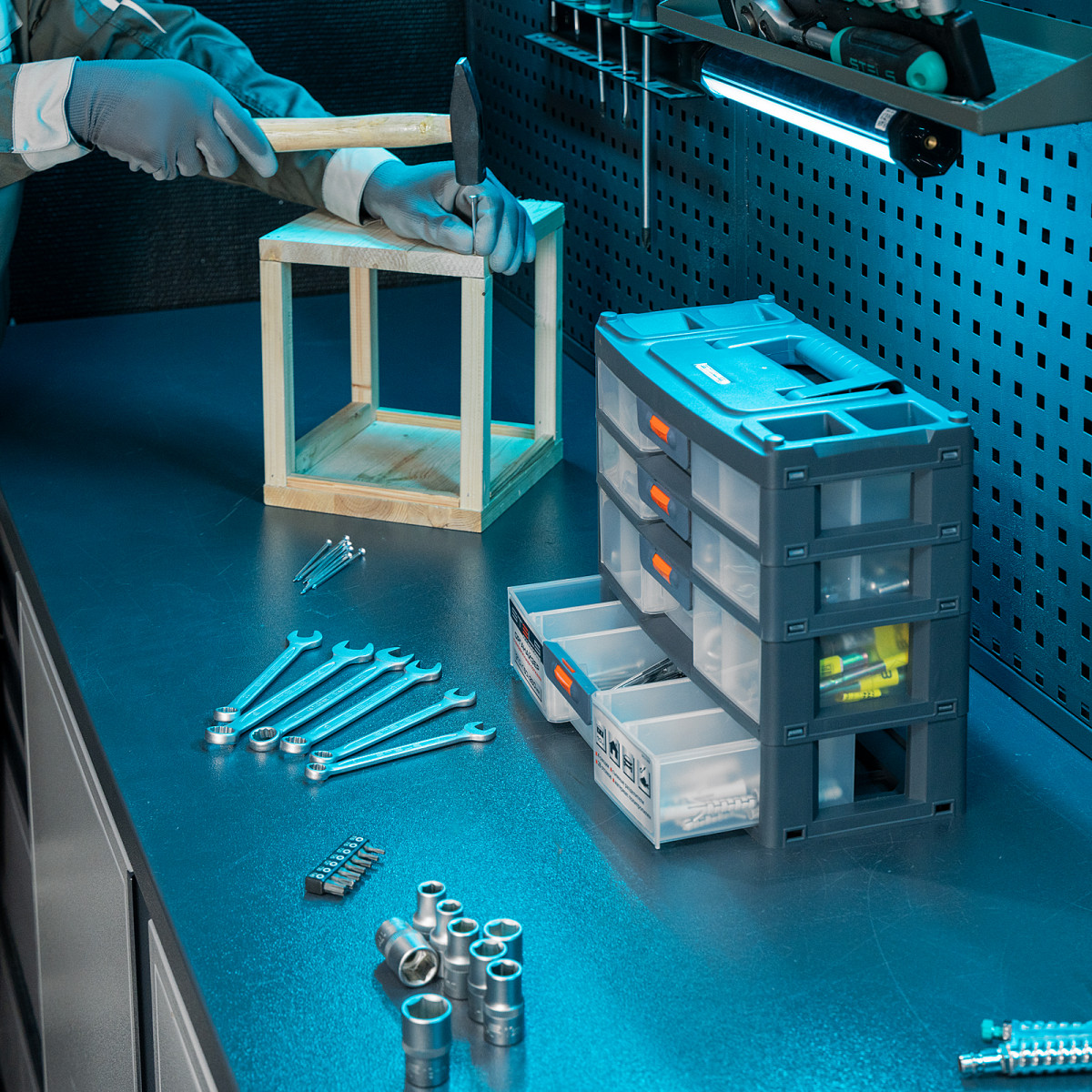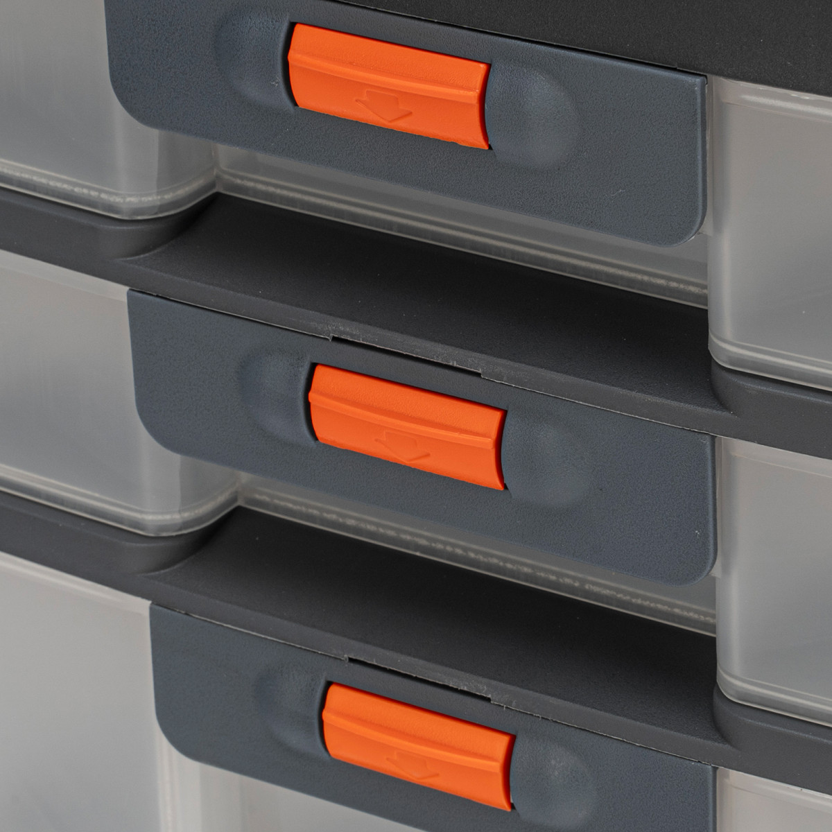 - Комфортная транспортировка — благодаря рукоятке и защелкам, предотвращающим случайное открытие, органайзер удобно перемещать.