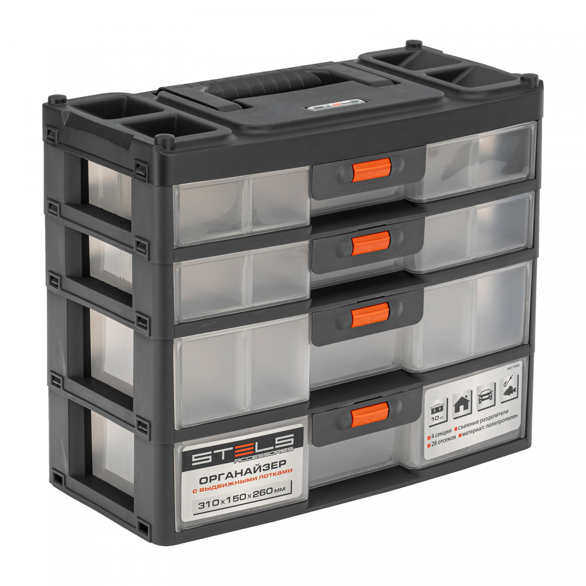 Органайзер для хранения с выдвижными лотками 310х150х260мм, 4 секции, пластик Stels