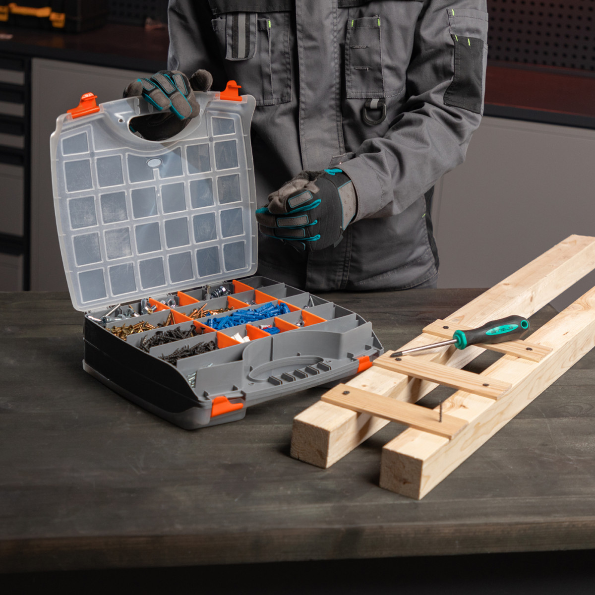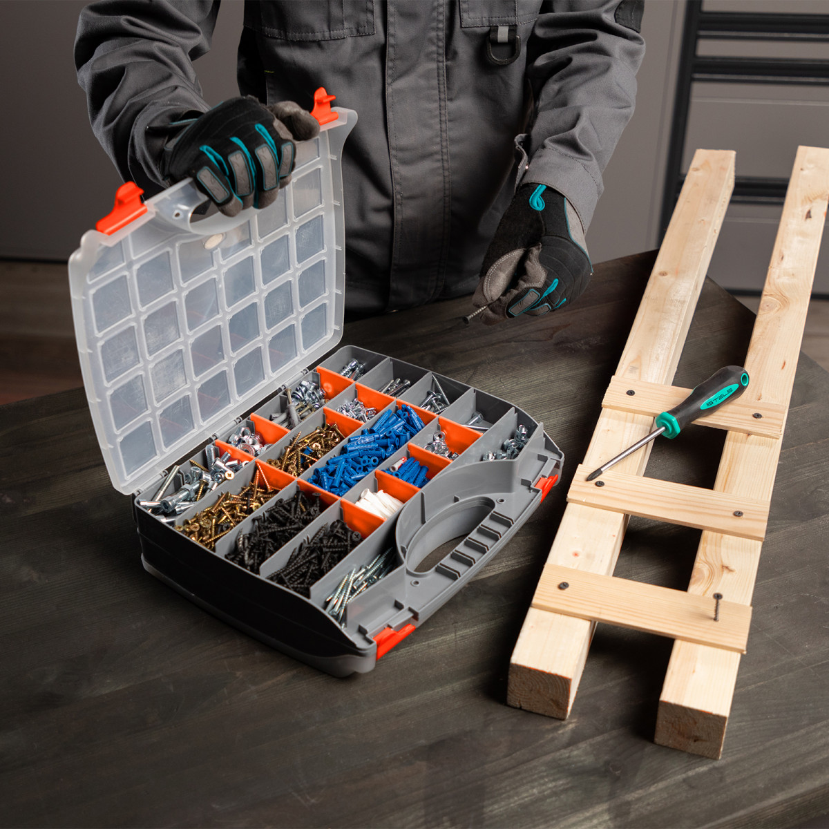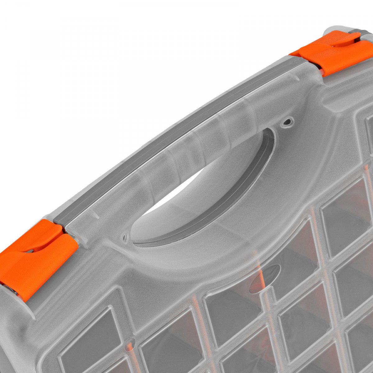 - Защелки и ручка обеспечивают удобство транспортировки органайзера.