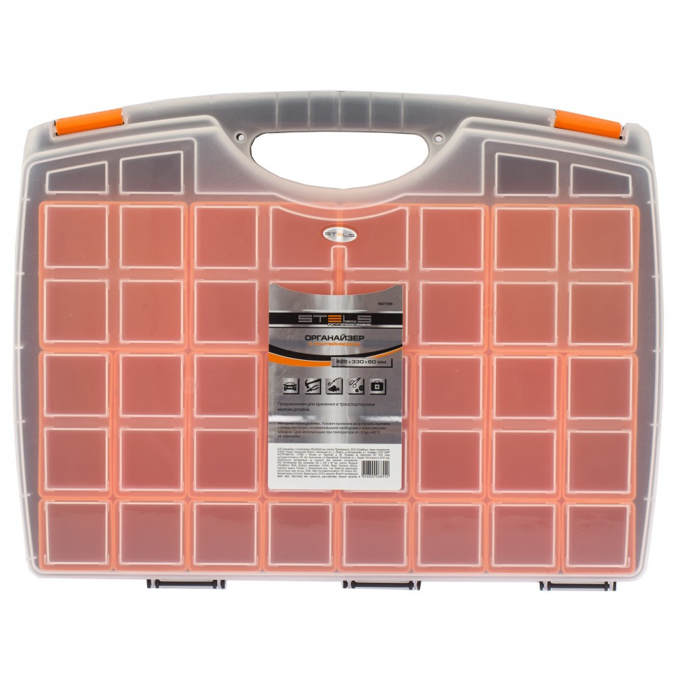 Органайзер с контейнерами Stels 90725 размером 425 х 330 х 60 мм, из пластика, пригодится в хозяйстве и мастерской для хранения крепежных элементов, принадлежностей для рукоделия, снастей и т.д. Он обеспечивает быстрый доступ к предметам, не допуская их перемешивания и утери.