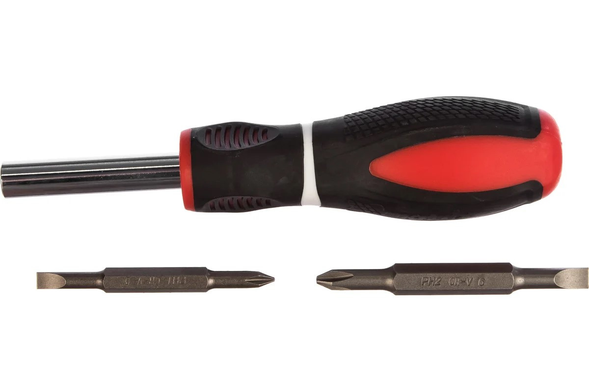 Комбинированная отвертка укомплектована стержнем и двухсторонними битами, что позволяет осуществлять монтаж/демонтаж крепежа со шлицами SL5,0 / PH1, SL6,0 / PH2.