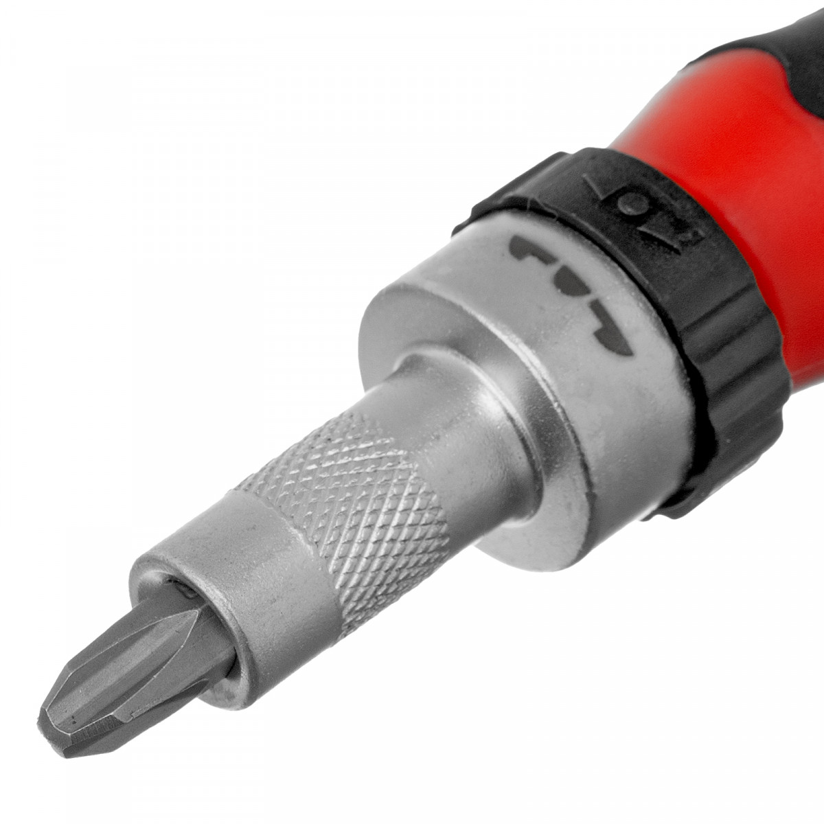 Реверсивная отвертка Matrix 11332 с набором бит и торцевых насадок из стали CrV, с присоединительным размером 1/4", 16 шт. в упаковке, предназначена для работ с резьбовыми соединениями. Благодаря торцевым головкам с адаптером может использоваться в качестве накидного ключа. Храповой механизм облегчает вращение отвертки и увеличивает скорость работы. Направление вращения можно менять при помощи кольцевого переключателя. Отвертка пригодится при сборке и установке мебели, ремонте бытовой техники, будет полезна дома, на даче или в гараже.