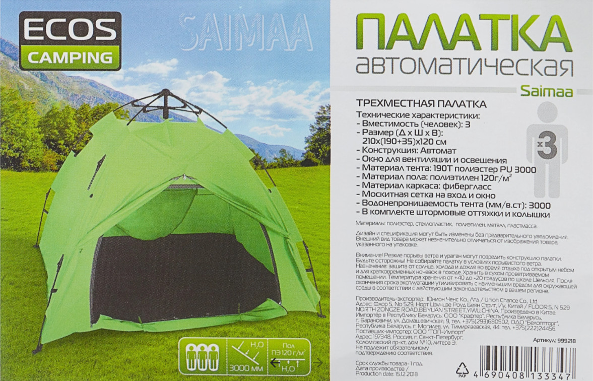 Автоматическая палатка Ecos Saimaa (190+35)х210х120см 999218 подойдет для отдыха на природе.