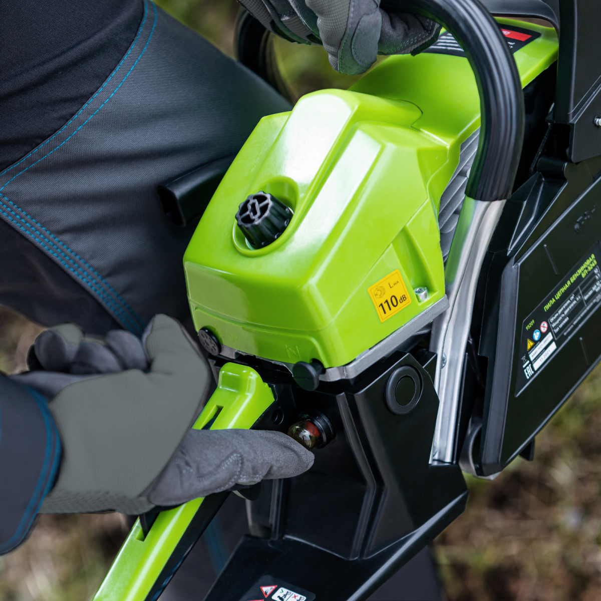 - Регулируемая система смазки цепи — автоматическая подача масла к пильной фурнитуре значительно увеличивает срок ее службы.