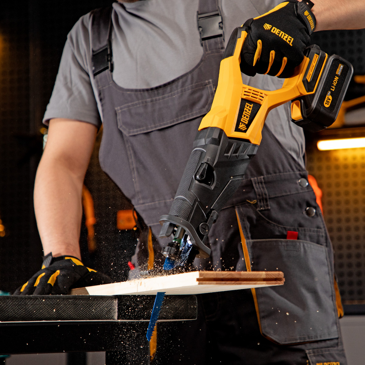 Сабельная аккумуляторная пила Denzel BRC-120-0 28461 с бесщеточным двигателем работает от аккумулятора Li-Ion с рабочим напряжением 18 В. Предназначена для распила фанеры, досок, ДСП, ДВП, пластика, а также для обрезки веток. Максимальная глубина пропила в древесине составляет 120 мм, в стали — 10 мм. Оснастка совершает до 3100 ходов в минуту, что обеспечивает эффективную работу. ,Пила поставляется без аккумулятора и зарядного устройства, к ней подходит универсальный аккумулятор емкостью 4 А/ч, совместимый с любым инструментом единой платформы Denzel battery system 18V серии IB.