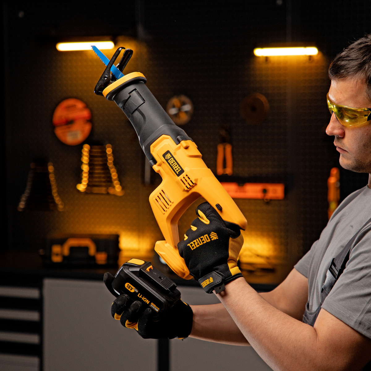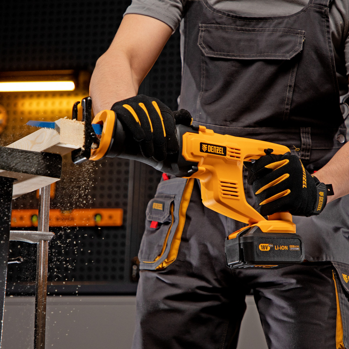 Сабельная аккумуляторная пила Denzel CRC-115 28465 работает от аккумулятора Li-Ion с рабочим напряжением 18 В. Предназначена для распила фанеры, досок, ДСП, ДВП, пластика, а также для обрезки веток. Максимальная глубина пропила в древесине составляет 115 мм, в стали — 10 мм. Оснастка совершает до 3000 ходов в минуту, что обеспечивает эффективную работу. ,Универсальный аккумулятор емкостью 4 А/ч, с интеллектуальной системой распознавания нагрузки, рассчитан на длительный срок службы. Он совместим со всеми инструментами единой платформы Denzel battery system 18V серии IB.