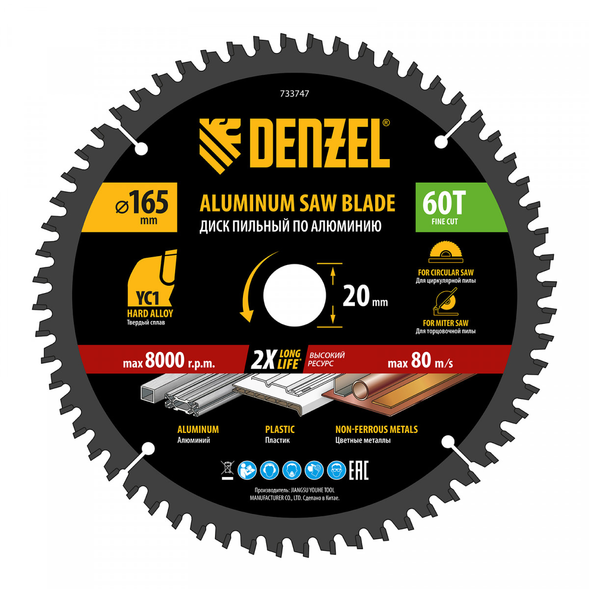 Пильный диск Denzel 733747 диаметром 165 x 20 мм, с 60 зубьями, предназначен для распиливания заготовок из алюминия, пластика, цветных металлов. Устанавливается на циркулярную или торцовочную пилу, поддерживающую максимальную частоту вращения 12000 об/мин, также возможно использование с распиловочным станком. Зубья трапециевидно-плоского типа (TCG) с отрицательным углом заточки обеспечивают ровный рез без сколов. В комплект поставки входит переходное кольцо 20/16 мм, позволяющее изменить посадочный диаметр при необходимости.