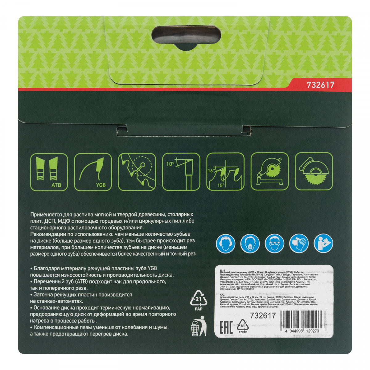 Пильный диск по дереву Сибртех 732617 диаметром 200 х 32 мм, с 24 зубьями и переходным кольцом 32/30, предназначен для быстрого распила древесины мягких и твердых пород, фанеры, ДСП, МДФ. Используется с циркулярными и торцовочными пилами с посадочным диаметром 32 мм. Переходное кольцо 32/30 позволяет при необходимости изменить размер посадки. Крупные зубья обеспечивают быстрый рез. Диск подходит для бытового применения.