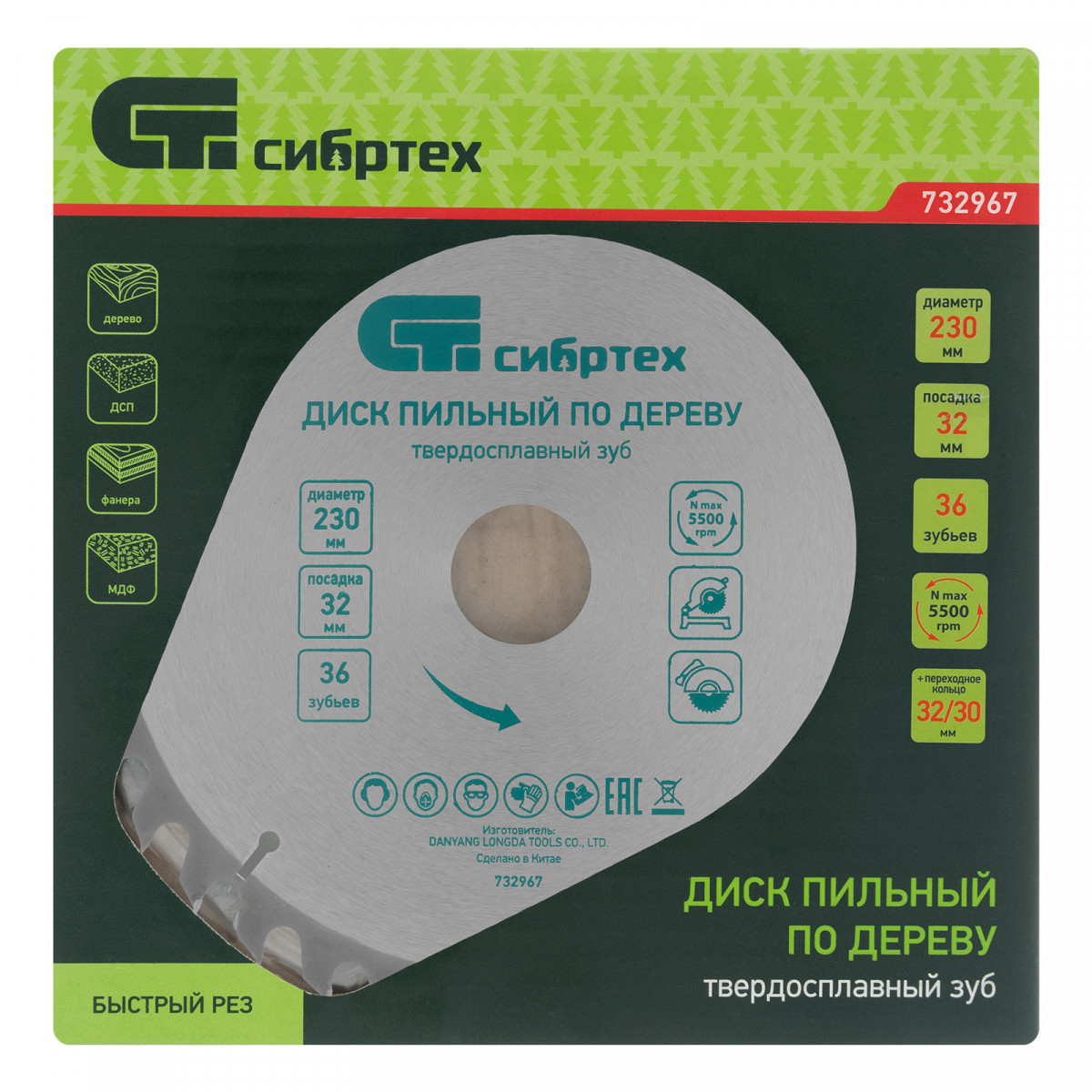 Пильный диск по дереву, 230 х 32 мм, 36 зубьев, кольцо 30/32 Сибртех
