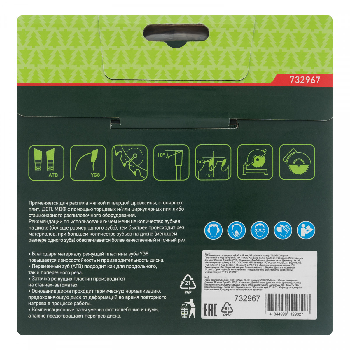 Пильный диск по дереву Сибртех 732967 диаметром 230 х 32 мм, с 36 зубьями и переходным кольцом 32/30, предназначен для быстрого распила древесины мягких и твердых пород, фанеры, ДСП, МДФ. Используется с циркулярными и торцовочными пилами с посадочным диаметром 32 мм. Переходное кольцо 32/30 позволяет при необходимости изменить размер посадки. Крупные зубья обеспечивают быстрый рез. Диск подходит для бытового применения.