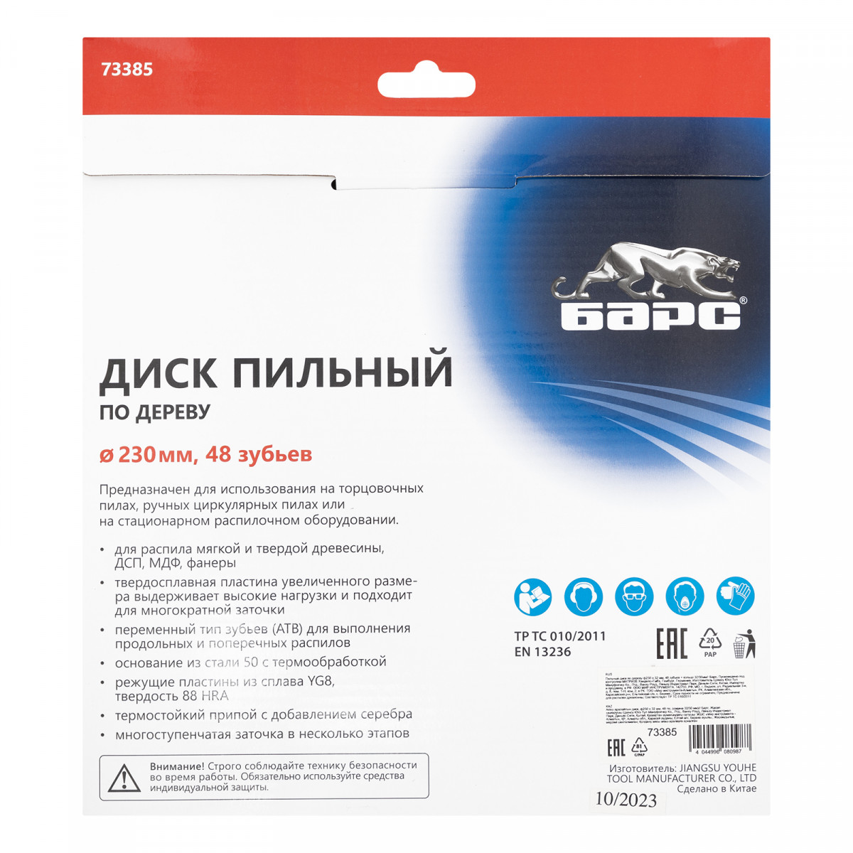 Пильный диск Барс 73385 диаметром 230 х 32 мм, с 48 зубьями и кольцом 32/30 мм, предназначен для быстрого пиления древесины мягких и твердых пород, ДСП, МДФ и фанеры. Мелкие зубья типа АТВ и оптимально подобранный угол зуба позволяют производить качественный поперечный распил. Диск используется совместно с торцовочными и циркулярными пилами с посадкой 32 мм. В комплект входит переходное кольцо на диаметр 30 мм, расширяющее возможности применения оснастки. Диск подходит для интенсивной эксплуатации и может использоваться в профессиональной сфере.